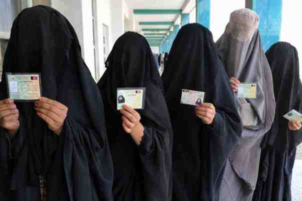 Burqa-clad Afghan women show identification cards as they wait to cast their votes at a school converted to a polling centre in Kandahar, Afghanistan.